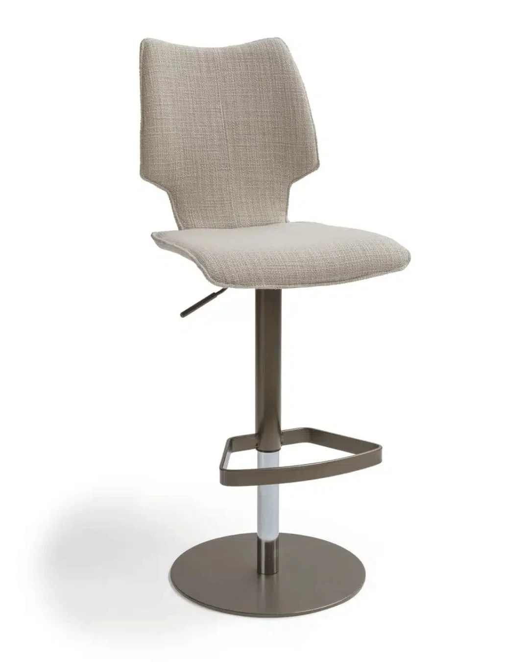 The Pick ‘n’ Mix is a modern, adjustable bar stool with a high, supportive back. The gas spring allows you to quickly adjust the seat height, and the fixed footrest, combined with the round disc base, provides a stable base for a kitchen island or bar table. The seat feels luxurious and can be upholstered in fabric or leather, from subtle natural to bold colours. The base can be finished in your choice of epoxy resin, such as black, anodic brown, anthracite, white, or beige, so the Pick ‘n’ Mix complements your interior perfectly. This bar stool combines comfort with a sleek design and is made for comfortable seating every day. This bar stool will lower enough to use as an extra dining chair when needed.