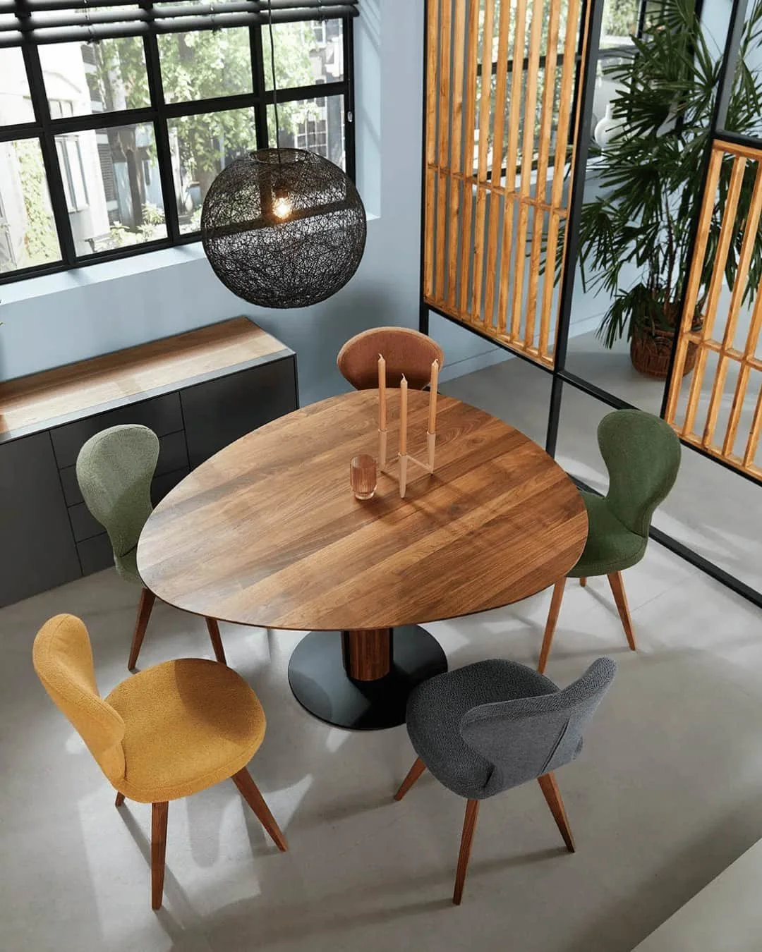 The Smartie dining room chair stands out for its elegant curves. The Smartie is ideal for those who want to keep the dining area a bit compact, but still nice and modern and striking. The dining chair 'pops' completely when upholstered in a bold, contrasting fabric-leather combination. In addition, this light, compact chair likes to be placed at the dining table in multiple colours.